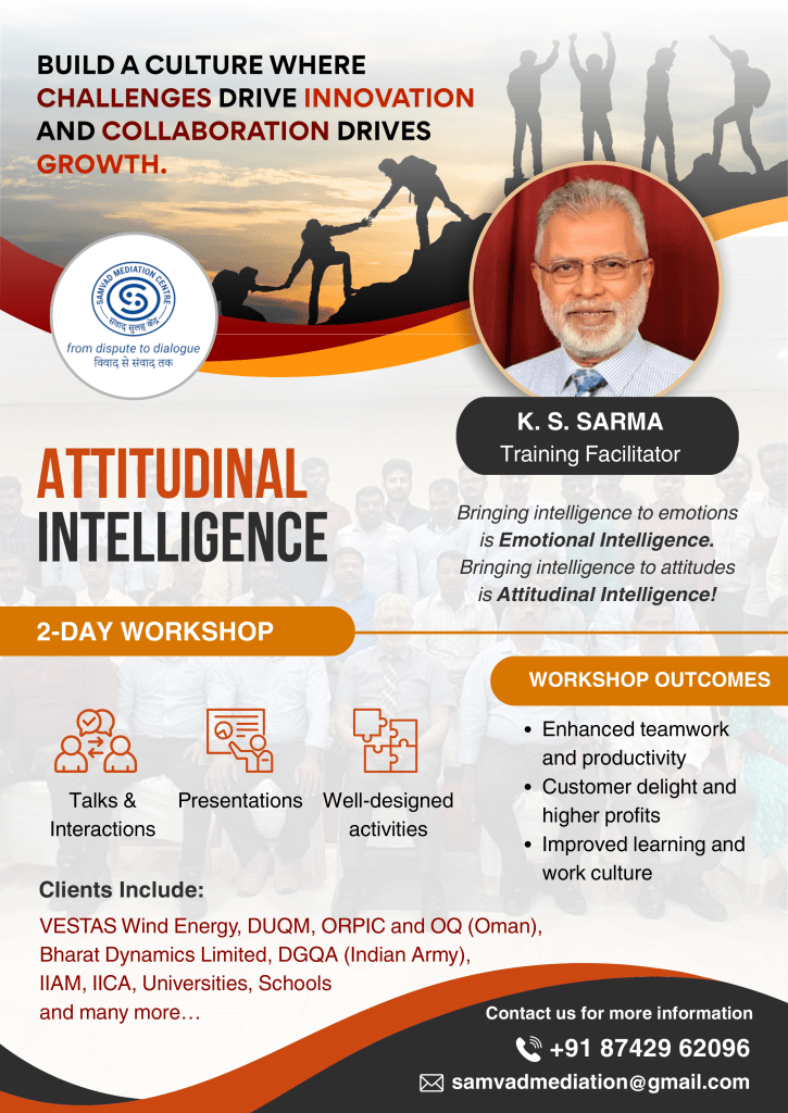 Samvad Mediation Centre is proud to announce a unique workshop onย Attitudinal Intelligence.ย